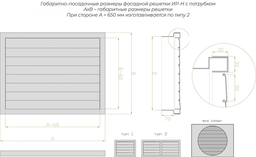 Решетка ИР-Н по назначению и функциональности полностью повторяет инерционную решетку ИР. Единственным конструктивным отличием является накладной тип исполнения, ее рамка сделана без внешнего фланца. Решетка ИР-Н накладывается на проем, либо полностью утапливается в проеме.